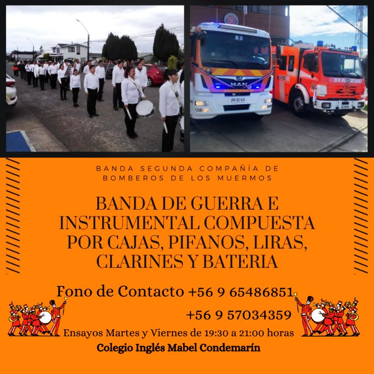 Estimadas y Estimados, tengan Uds. muy buenas tardes, les quiero comentar que ayer me reuní con Directivos de Bomberos de la Segunda Compañía, solicito su ayuda a los profesores, para socializar con estudiantes de 7° a 4° medio, que ya cuentan con experiencia en los instrumentos indicados en el afiche, propios de una Banda de Guerra…